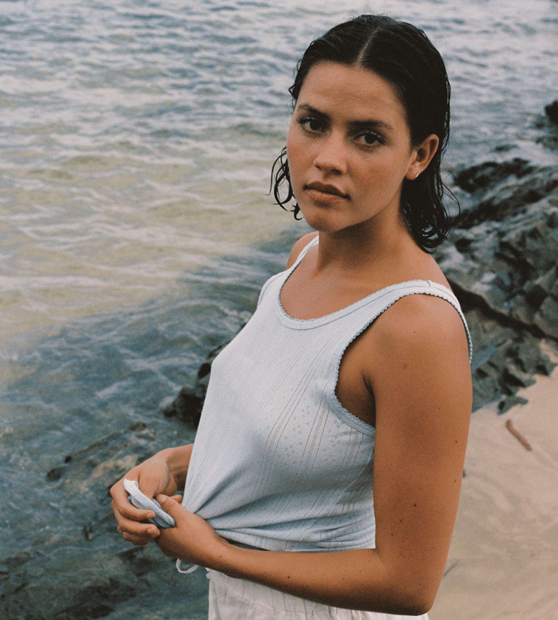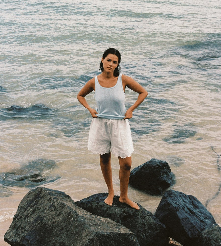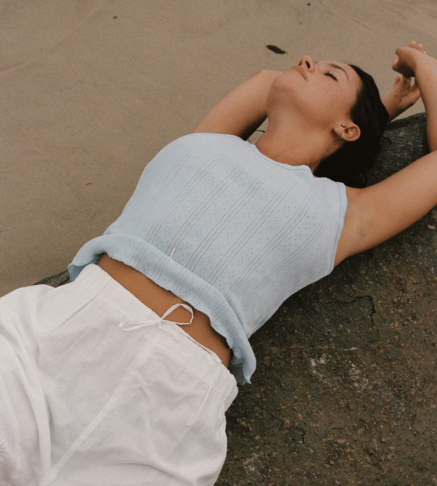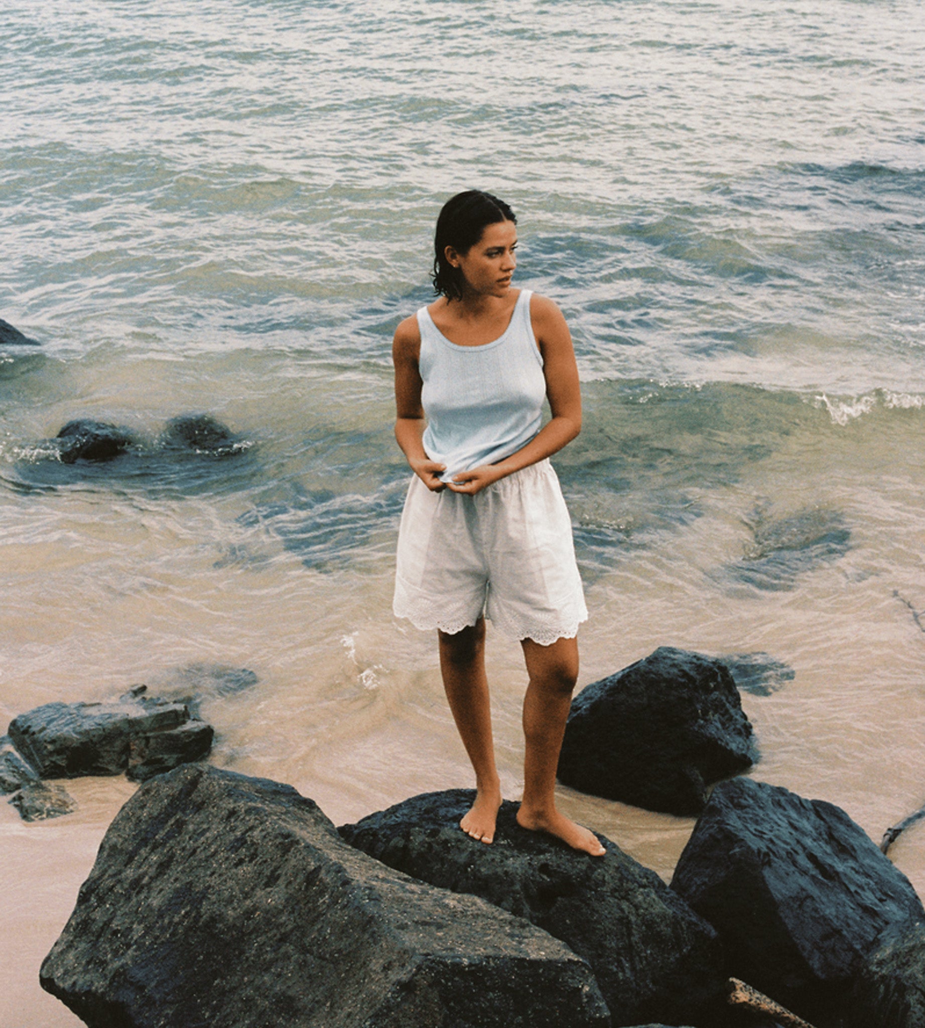 A fine ribbed knit with vintage-inspired pointelle detailing and a gently scooped neckline. Super soft with just enough stretch. 100% cotton.