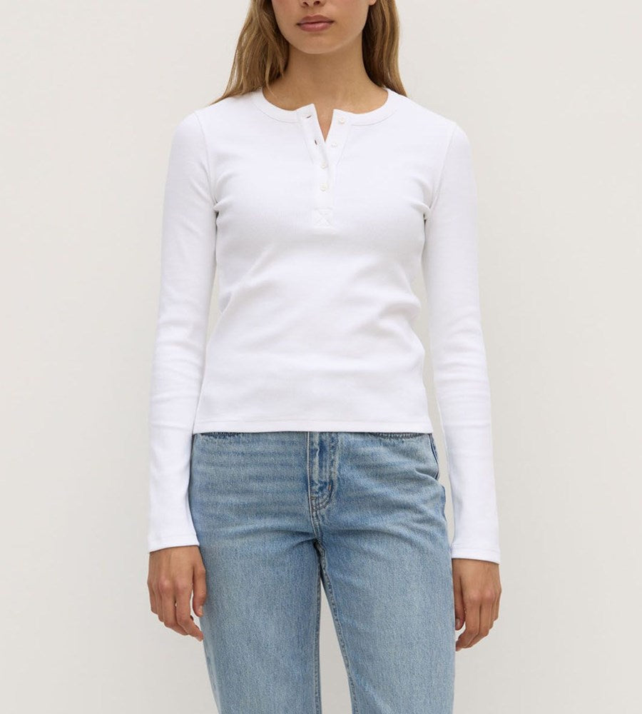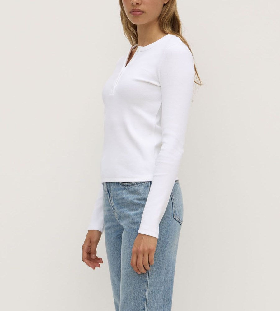 An elevated take on an everyday essential, the Anya Long Sleeve Tee features a classic henley neckline with a three-button detail and a slim, flattering fit. Crafted from soft, breathable cotton with subtle stretch, it’s designed for effortless layering or easy solo wear. A timeless wardrobe staple in crisp white, perfect with denim, skirts, or tailored pieces.