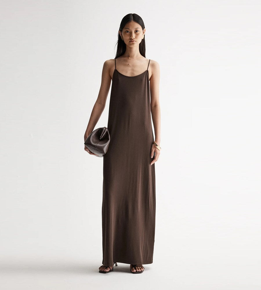 Refined silhouettes combined with luxurious fabrics, the Anjou Dress feels relaxed and looks elevated. Made with a soft stretch fabric, this dress drapes the body effortlessly. With a low scoop neckline, thin rouleau straps, and a centre back split, this maxi length dress is an exploration of transitional outfitting ideal for day to night events.